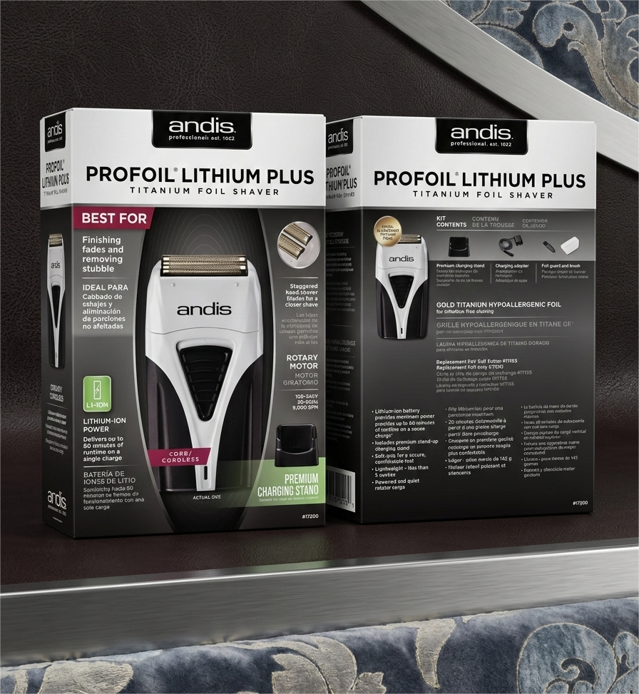 TITANIUM EDITION — The Gold Standard in Professional Finishing Ultra-Close Precision • Advanced Lithium Power • Elite Barber Performance Upgrade your grooming arsenal with the Andis® ProFoil Lithium Plus (Model #17200) — a professional-grade finishing shaver engineered for barbers and stylists who demand perfection. Designed for ultra-close tapering, seamless fade blending, and precise stubble removal, this Titanium Edition delivers a razor-smooth, skin-level finish without irritation. From high-volume barbershops to detail-focused stylists, this is the tool trusted to perfect the final touch.